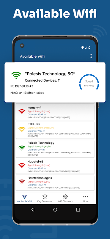 Analizator połączenia WIFI dla Androida jest korzystny do podłączenia sieci WIFI za pomocą 8-cyfrowego kodu PIN, który jest powszechnie predefiniowany w routerze WIFI. Problem polega na tym, że wiele firm dostawców routerów instaluje własne luki w zabezpieczeniach, takie jak kody PIN, których używają. WIFI Connection Analyzer zaleca tester sygnału WPS/WPA i szybką sieć dla Twojego urządzenia.