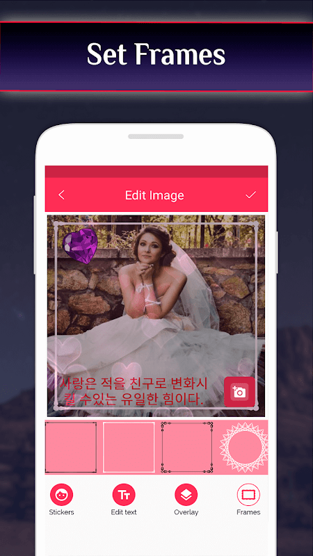 Korean Photo Text Editor with Korean Keyboard contains multiple stylish fonts and 50 colors which can be useful to create gradient color on a text and shadow to the background of a text. Write Korean on Photo : 사진에 한국어를 씁니다. includes 100+ HD photos to create a quote photo and also includes 100+ quotes in the Korean language or you can write Korean poetry on photo. Write Korean Text on Photo also contains 25+ beautiful overlays and 25+ latest frames to create wonderful images.