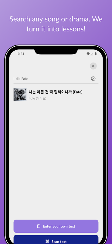 Wklej lub zeskanuj dowolny koreański tekst — artykuły prasowe, wiadomości lub notatki — a Yaeum rozbije go na słowa, które możesz zapamiętać i powtórzyć w dowolnym momencie.