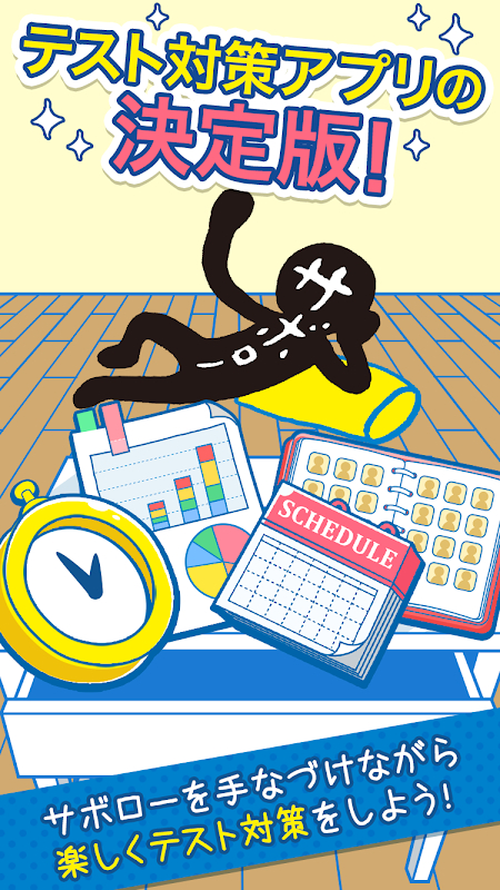 「中学校のテスト期間。つらくて、めんどくさい。そして忍び寄るサボローの誘惑・・・。楽しく、前向きに乗り切れたらいいのにっ!」そんなキミにぴったりのアプリがついに登場!
