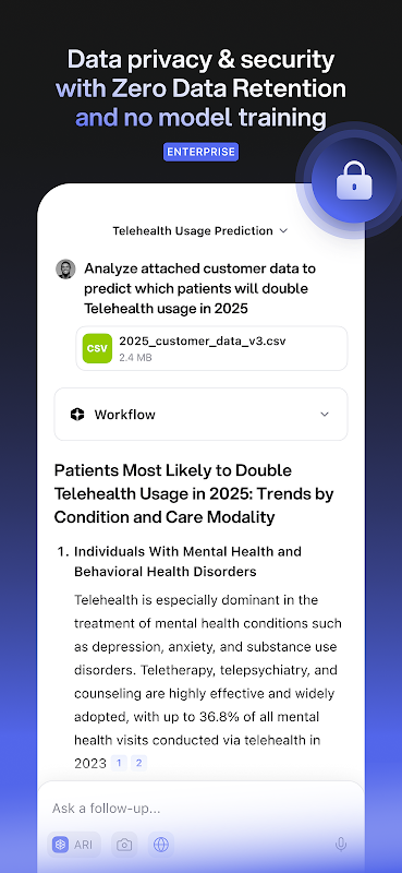 - ARI (Advanced Research & Insights) – najinteligentniejszy na świecie agent dogłębnych badań. W 76% testów porównawczych ARI dostarcza głębszych analiz i przewyższa Deep Research firmy OpenAI. ARI może przetwarzać ponad 500 źródeł i dostarczać dopracowane, profesjonalne raporty w zaledwie kilka minut, z bogatą grafiką i weryfikowalnymi cytowaniami.