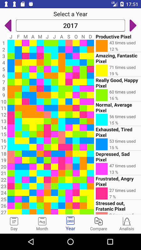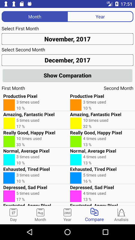 See your overviews in a monthly and yearly base. Compare a time period with another to see if you are changing your moods and finally review, what weekday is the one that is mostly effected by a specific mood.