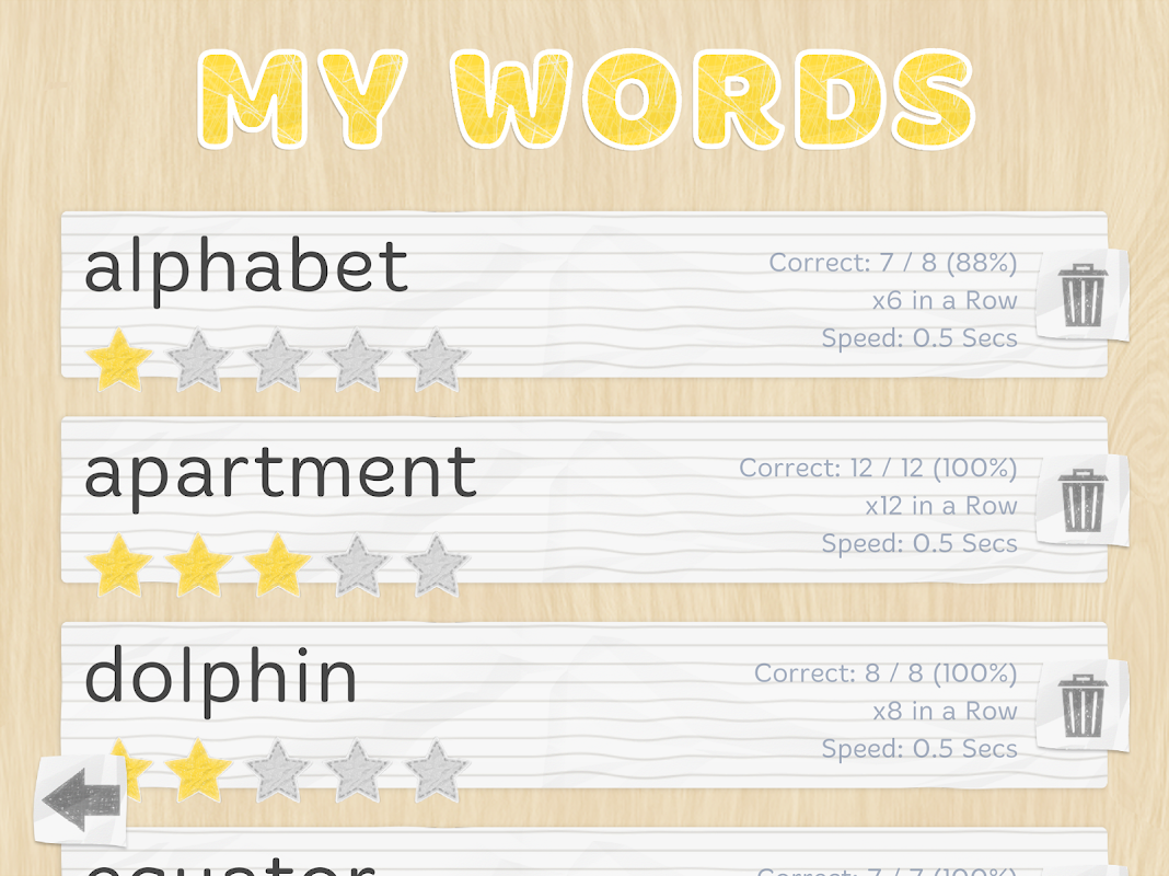 Dodaj własne słowa lub otrzymuj sugerowane słowa odpowiednie dla Twojego poziomu pisowni. Zdobywaj gwiazdki, opanowując nowe słowa.
