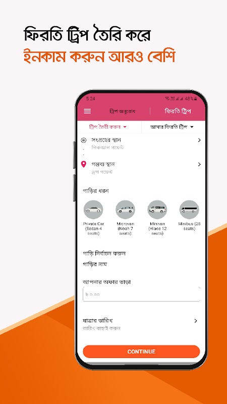 যে ধরনের গাড়ির ট্রিপ / ভাড়া আমাদের অ্যাপটির মাধ্য খুঁজতে পারবে: