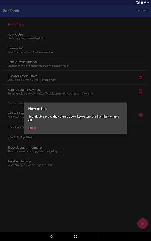 ZapTorch uses an Accessibility service to help users with disabilities easily toggle the flashlight functionality on their Android devices. It does so by monitoring when the user double-presses the Volume Down button on their device.