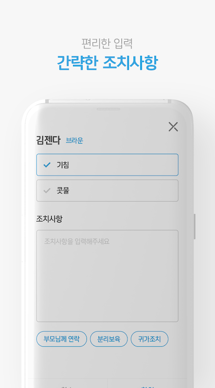 젠다 전용 블루투스 체온계를 사용하여 쉽고 빠르게 체온을 측정하고 원아의 증상 및 조치사항을 메모 할 수 있습니다.