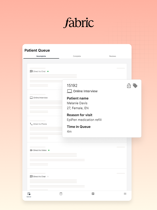 Dzięki ponad 15-letniemu doświadczeniu w opiece asynchronicznej Fabric jest liderem na rynku wywiadów adaptacyjnych online. Pakiet wirtualnej opieki Fabric zapewnia szpitalom, systemom opieki zdrowotnej, klinikom i grupom dostawców możliwość przezwyciężenia krytycznych wyzwań stojących przed branżą opieki zdrowotnej, w tym niedoborów kadrowych, wypalenia personelu i wycieku pacjentów. W tym podejściu asynchronicznym priorytetem jest doświadczenie pacjenta i świadczeniodawcy, aby zmniejszyć wypalenie zawodowe lekarza, jednocześnie zwiększając dostęp do opieki i satysfakcję pacjenta.