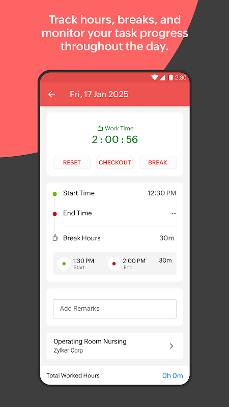 Możesz łatwo sprawdzić i sprawdzić swój czas pracy i dodać godziny przerwy na codzienne czynności. Realtime Checkin pozwala również na zresetowanie czasu pracy.