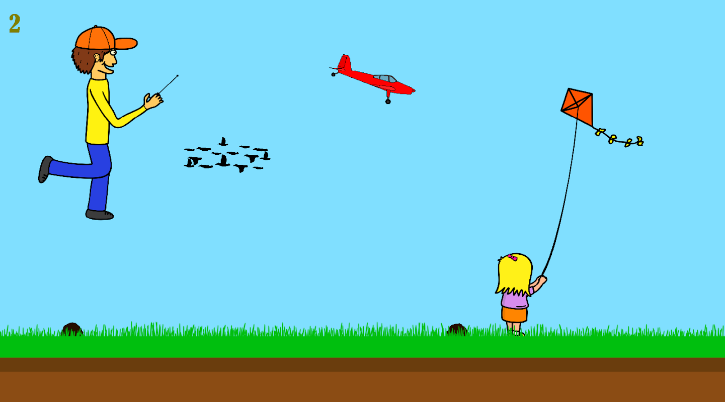 The player must not hit molehills and rocks and the plane must not get hit by birds, kites and flying saucers, and also not hit the ground, rocks and molehills. And don't fly too high, otherwise the plane switches off and you'll have to take another shot as well.