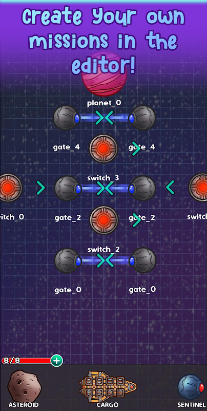 Destroy asteroids, allow the transit of cargo spaceships, hide yourself from sentinels, disable the laser gates and reach the planets to finally refill your fuel and resources.