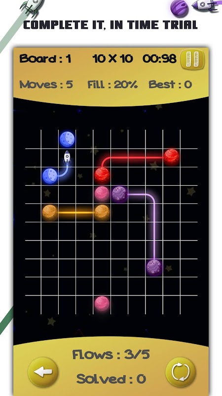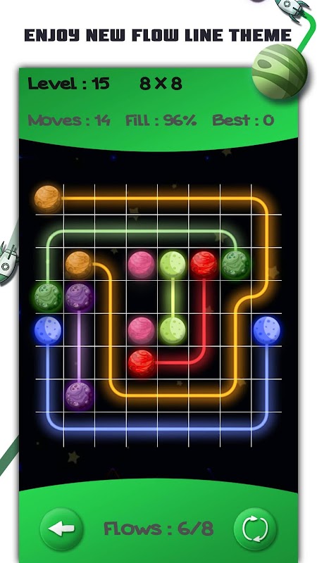 Connect matching planets with rockets to create a Flow. Pair all Planets, and cover the entire board to solve each puzzle in Flow Line. But watch out, pipes will break if they cross or overlap! Free play through hundreds of levels, or race against the clock in Time Trial mode. Flow Line game play ranges from simple and relaxed, to challenging and frenetic, and everywhere in between. How you play is up to you. So, give Flow Line a try!!! Flow Line is a game where you have to match Planets with a Rocket to create a flow or a pipe. Pair all Planets with the same type and make sure to cover the entire board to solve each level. A puzzle game for you and your children, it will not be a waste of time. It allows you to improve your analytical skills and perception and skill.