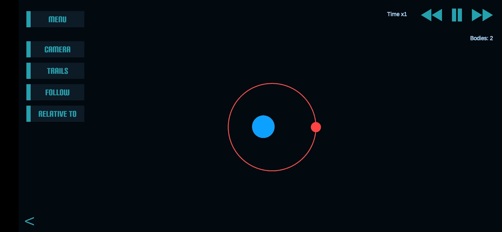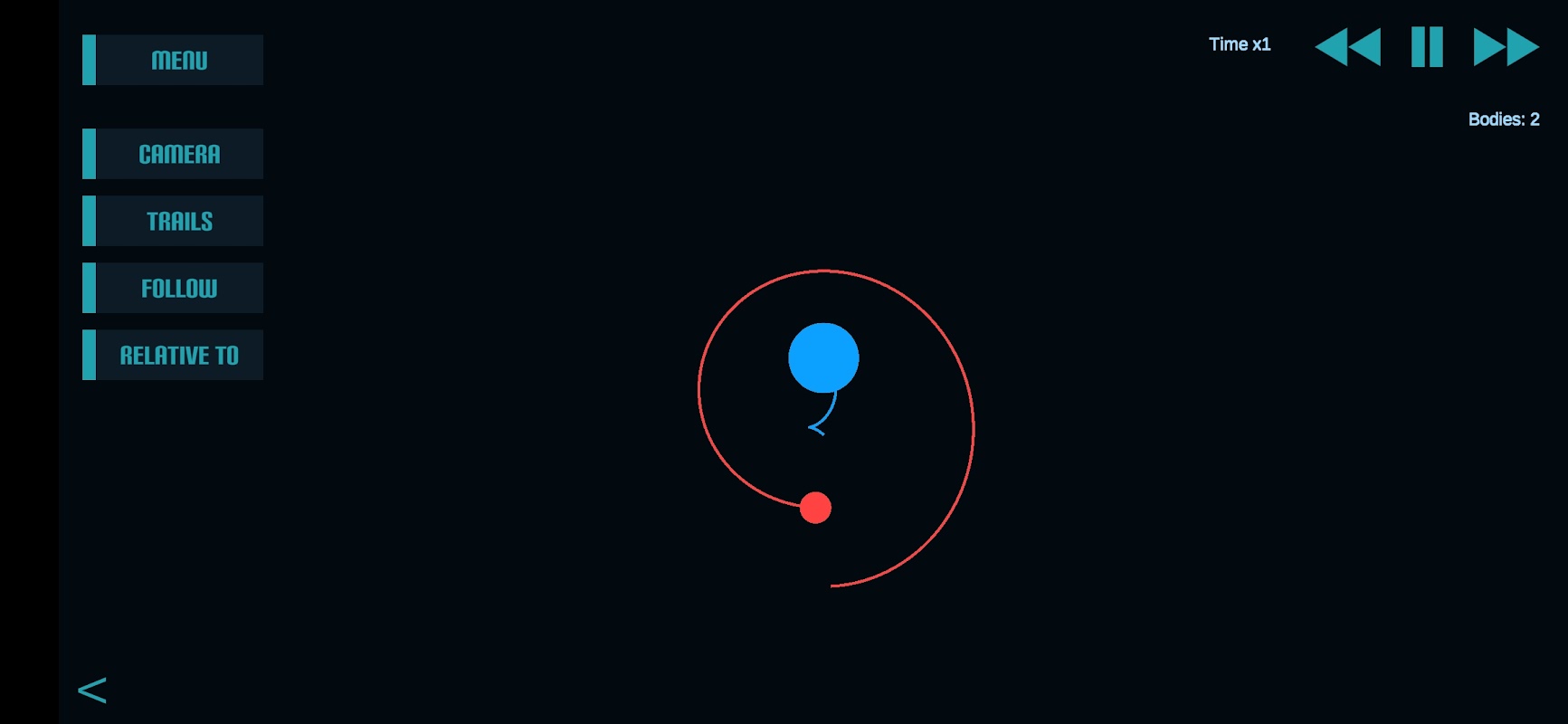 Camera mode, move freely through space, select the center of mass or any celestial body to follow it.