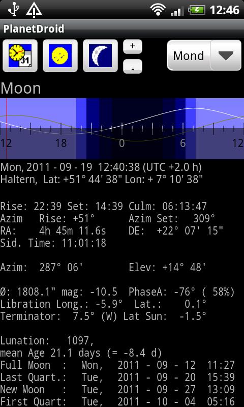 Since version 3.0 Planetdroid comes with a visibility diagram. You see the elevation above the horizon of your selected body (white line) of the current nicht and the elevation of the sun (dark yellow line), as well as the twilight times. The horizontal black line ist the horizon, the vertical red line your selected time.