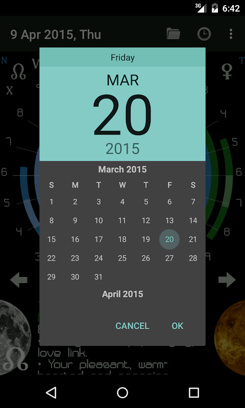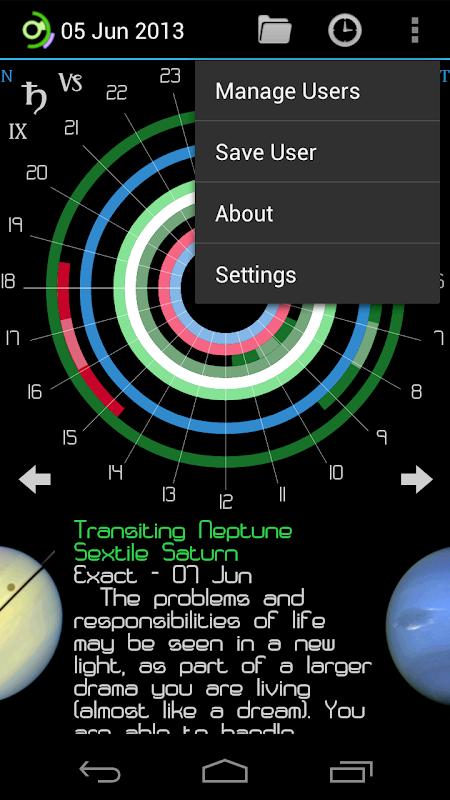 • For any date, instantly shows the interactive 24-hour clock face with transiting aspects - your astrological weather forecast