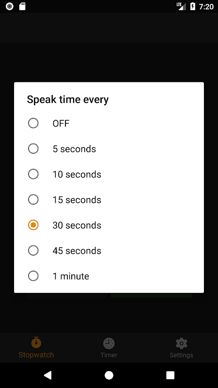 Stopwatch: The app speaks out the elapsed time at the specified interval. Example: "5 seconds", "10 seconds"....1 minute 30 seconds" and so on until stopped.