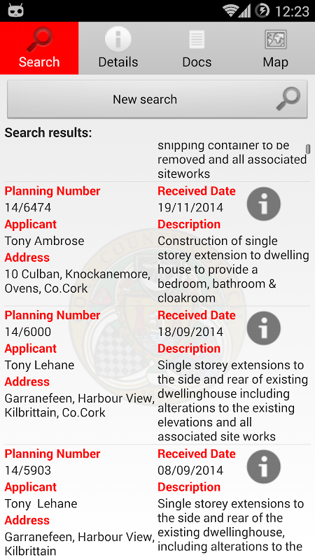 Gives users access to the Cork County Council planning application database. View up to date information regarding planning applications lodged in your area. Access documents and drawings submitted with applications. View the site with Google map.