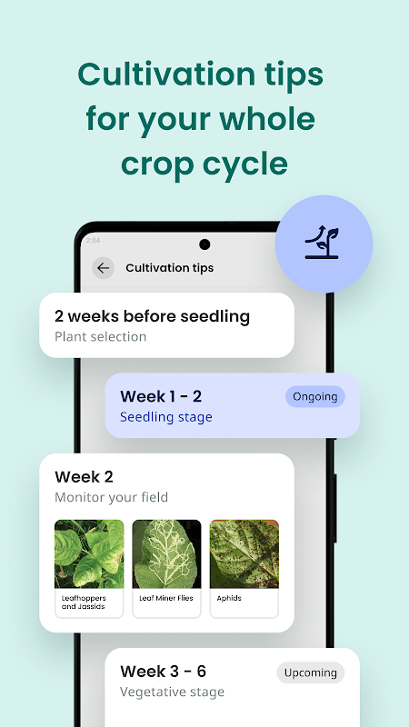 Get the most out of your crops by following effective agricultural practices and applying preventive measures. The Plantix app gives you an action plan with cultivation tips for your whole crop cycle.