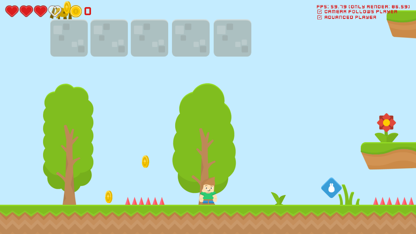 - Full platformer gameplay. Player can move, jump, pick up a weapon, be hurt by enemies, be hurt by obstacles, collect things, die, finish the level. Extra jumps in the air are possible (check out Advanced player checkbox). Enemies move following a simple pattern.