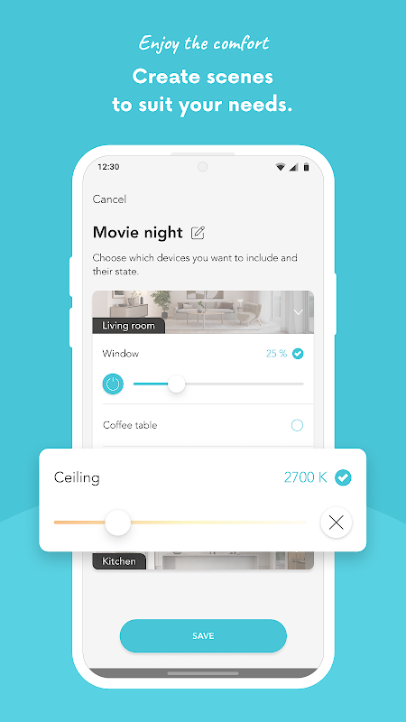 Using the app, you can easily create scenes to suit your varied needs. These scenes are then activated either from the app or your regular light switches.