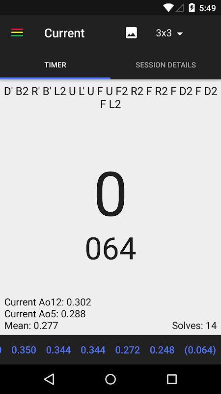 • Viewing solves' timestamp, scramble, and changing/viewing penalty (Touch the solve in the list on the bottom)