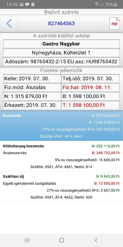 - Bejövő számlák listája, a számlák részletes adatai és a csatolt dokumentumok