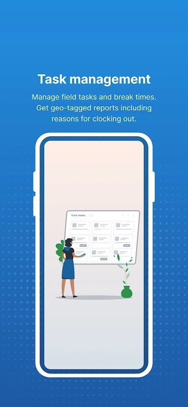 - Task management- Manage field tasks and break times. Get geo-tagged reports including reasons for clocking out.