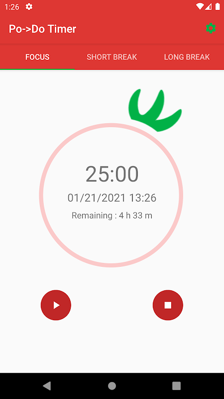When the time comes, the "Focus" and "Break" buttons will be displayed in the center of each screen of "Focus", "Short break", and "Long break". The vibration is stopped by pressing the button. (If the vibration does not stop due to the timing of notifications of other apps, it will also stop with the back button or home button.)
