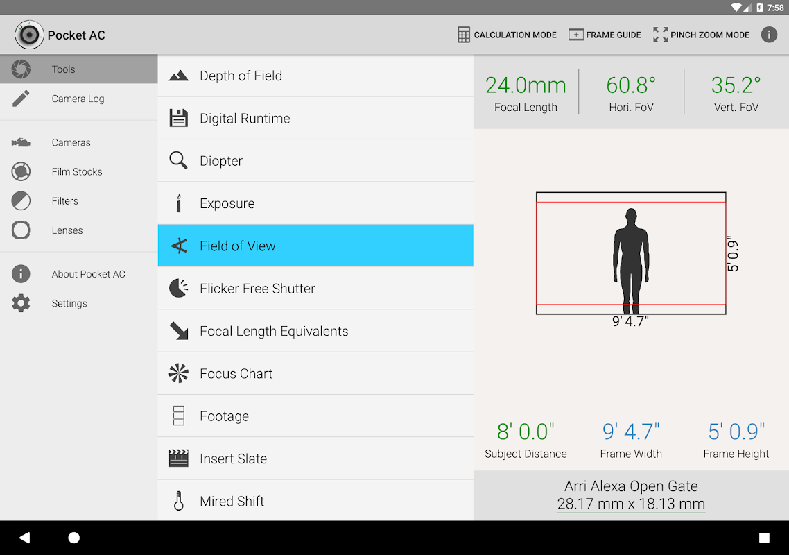 Pocket AC is a collection of tools and reference tables for cinematographers, camera assistants, operators, DITs, and videographers developed by a camera assistant. It features various calculators and charts to help prep and execute productions. In addition, the included camera log allows ACs to quickly log shots and email the setups of the day.
