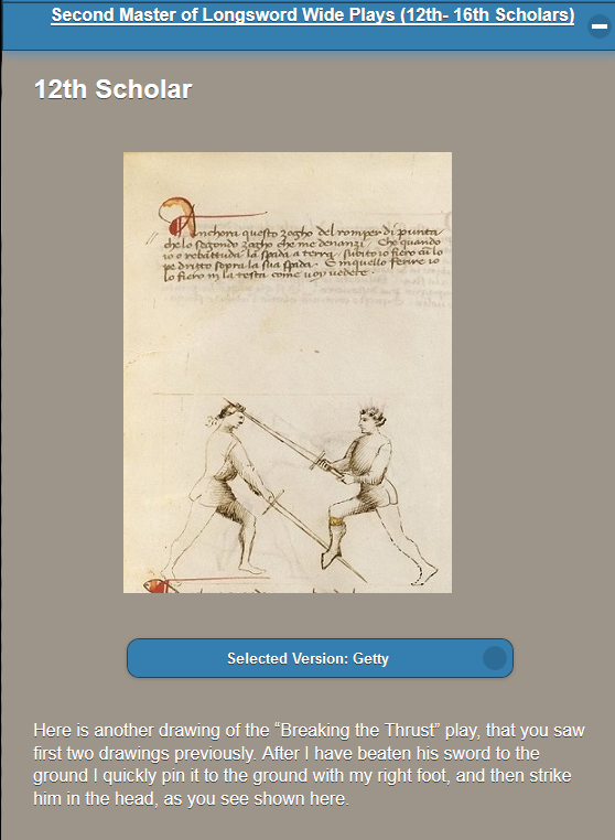 Within this application you can find full copies (with included translations) of all four available versions of this manuscript, as well as the ability to compare fencing plays between the different manuscript versions when applicable.