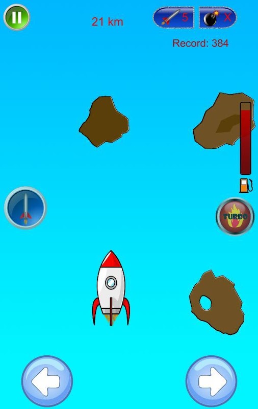 You can drive using the buttons on the screen, or by movements, using the accelerometer of your Smartphone. The control of the rocket by the accelerometer is amazing! Try to fly your Rocket through the accelerometer sensor!
