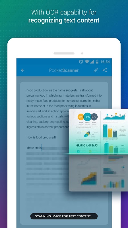 The document scanner app also has built-in OCR (Text Recognition) engine that scans and extracts text from digital documents and images. Pocket Scanner app is simple and straightforward to use. Simply point the cam scan at the file you wish to convert to JPG or PDF, and start scanning documents. The document will be scanned and saved in the format of your choice instantly. It's like having a scan bot in your pocket and the only document scanner you will ever need.
