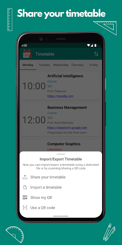 - Import/Export a timetable using a dedicated file or by scanning/sharing a QR code
