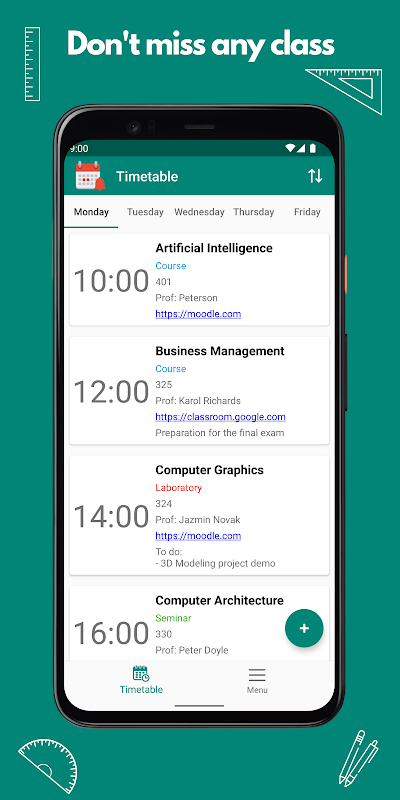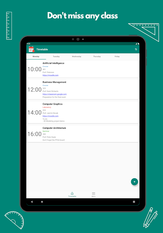 Pocket Timetable is the perfect tool for school, college or university. Keep track of your classes and manage your schedule with ease. Get notified before the start of any course.