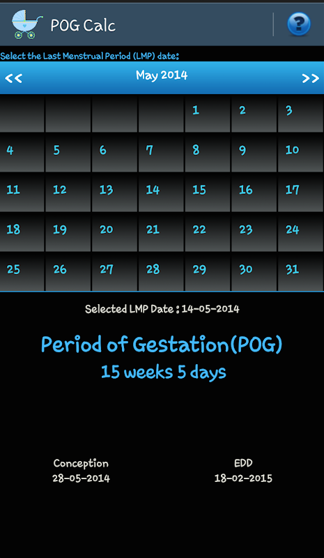 POG Calc is the fastest application ever created for this purpose wherein the results are obtained in just 2 seconds. The sole purpose of this app is to calculate the POG (Current gestational age) from the date of LMP and also from EDD. This app also gives you the Date of conception and Expected delivery date (EDD). All this app requires is two touches ( to enter LMP) and Bam!!! …the POG, Date of conception and EDD flashes instantly. This application has a very simple user-friendly interface & can even be used by someone with little knowledge on android apps. This app is mainly designed for Doctors, nurses, midwives and pregnant mothers.