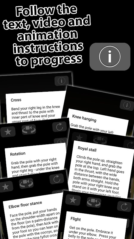 This app will help you to study Pole Dance moves by showing them from different perspective (POV: side and top) with audio and text descriptions.