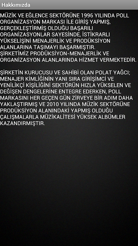 Bu application'i indirerek Poll Production ve sanatçılarına ait olan haberleri takip edebilir, sanatçıların albümlerindeki şarkıların kısa versiyonlarını dinleyebilir, yasal video kliplerini izleyebilir ve konserlerini takip edebilirsiniz.