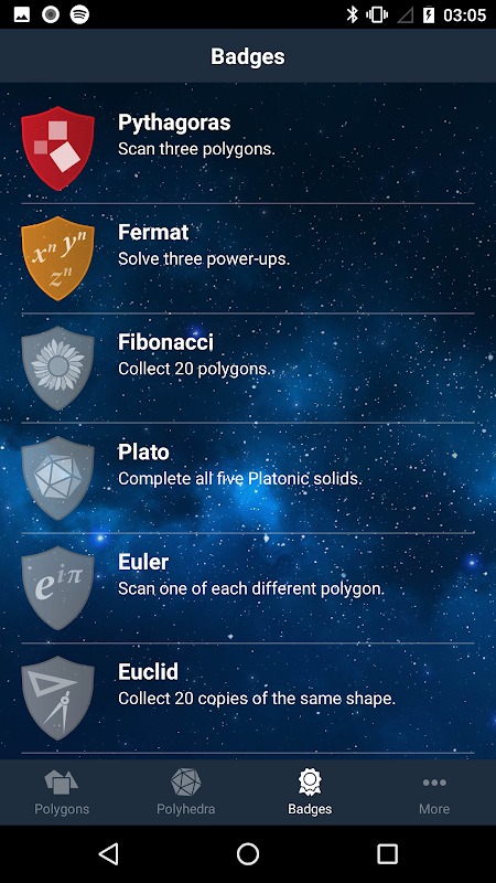 Polygon allows users to discover polygons hidden in museums or science centers, and use them to construct Platonic and Archimedean solids. Scan polyhedra with your phone’s camera, answer mathematical questions to get powerups with additional shapes, and view the finished solids in 3D.