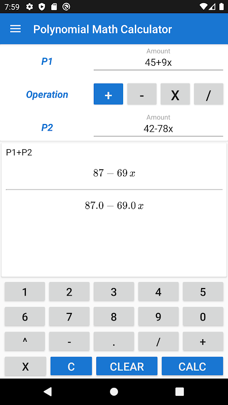 A perfect application if you are a student or a scientist and want to add, subtract, divide or multiply any polynomials.