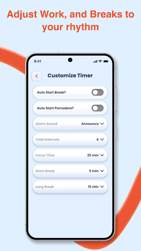 - Personalize your focus time, short and long breaks, and intervals.