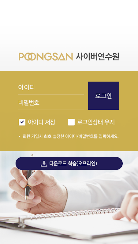 PC환경의 POONGSAN 사이버 연수원 (http://poongsanhrd.hunet.co.kr)의 아이디와 비밀번호로 로그인 가능하며, 교육과정 안내/신청, 나의 강의실 등 주요 서비스를 본 모바일 앱에서도 사용하실 수 있습니다.