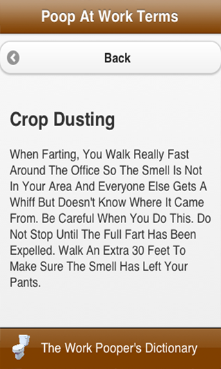 Poop At Work is a funny dictionary of terms used for on how to describe your co-workers bathroom habbits. From the "Astaire" to the "Cubi-stank" you can find them all here. Great for the morning water cooler laugh on a Monday at work.