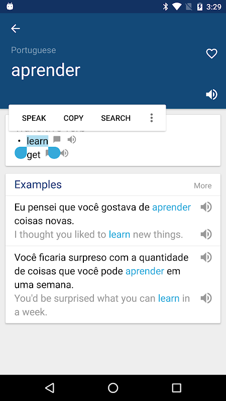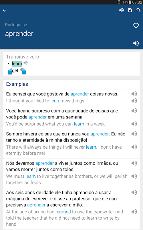 The Portuguese English Dictionary & Translator app enables you to search Portuguese & English words with definitions, examples, pronunciation, and more.