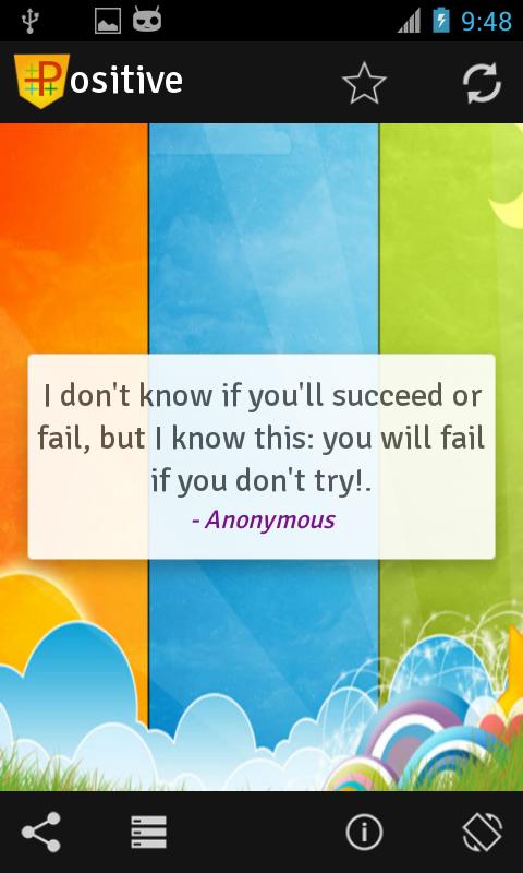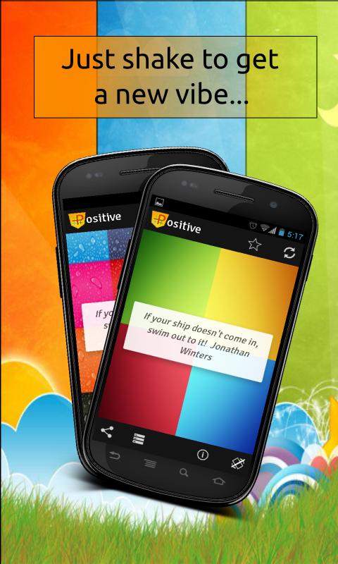 PositiveVibes is full of positive thoughts/quotes and sayings. We call it as positive vibes. PositiveVibes got more than 1000 positive vibes offline and more than 500+ positive vibes online. We are updating our online database frequently. So go ahead, download PositiveVibes and make your self Positive.