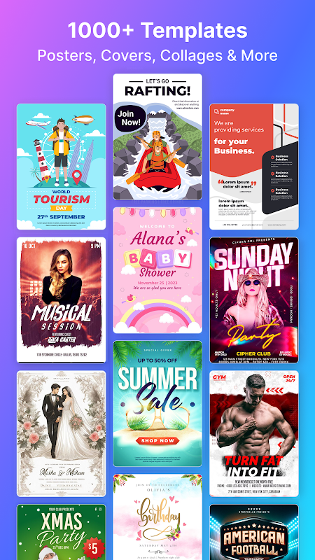 Poster Maker App has a growing library of customizable design templates. We have many categories of templates ready to give you a great start. With just a few taps, you can edit the fonts, colors, and styles and create a fantastic design that reflects your personality, style, and brand identity.