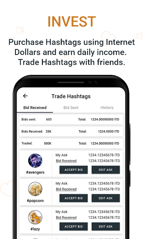 Purchase Hashtags using Internet Dollars and earn daily income. Trade Hashtags with friends.
