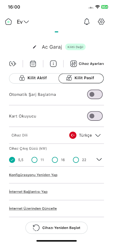 Şarj gücü ayarlama (5kW - 22kW arası)
