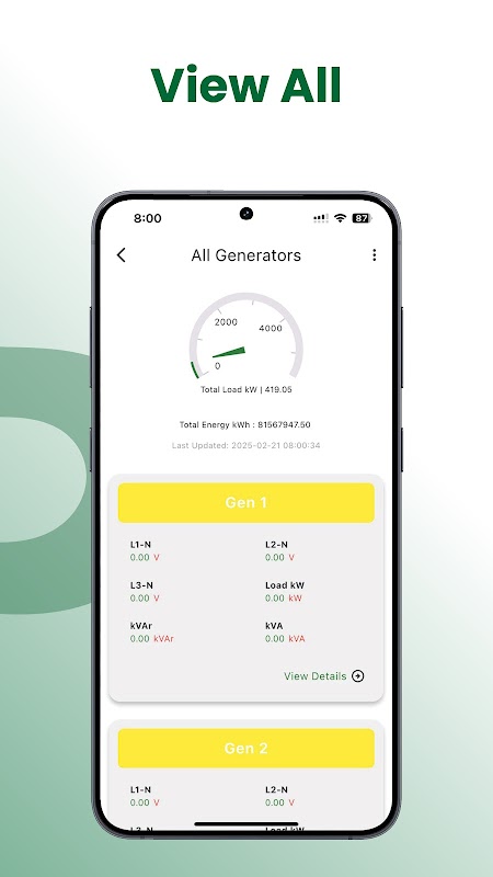 Voltages, currents, frequencies and power factor of generator and mains, in addition to other important readings such as the latest update time, running hours, coolant temperature, oil pressure, energy, etc..