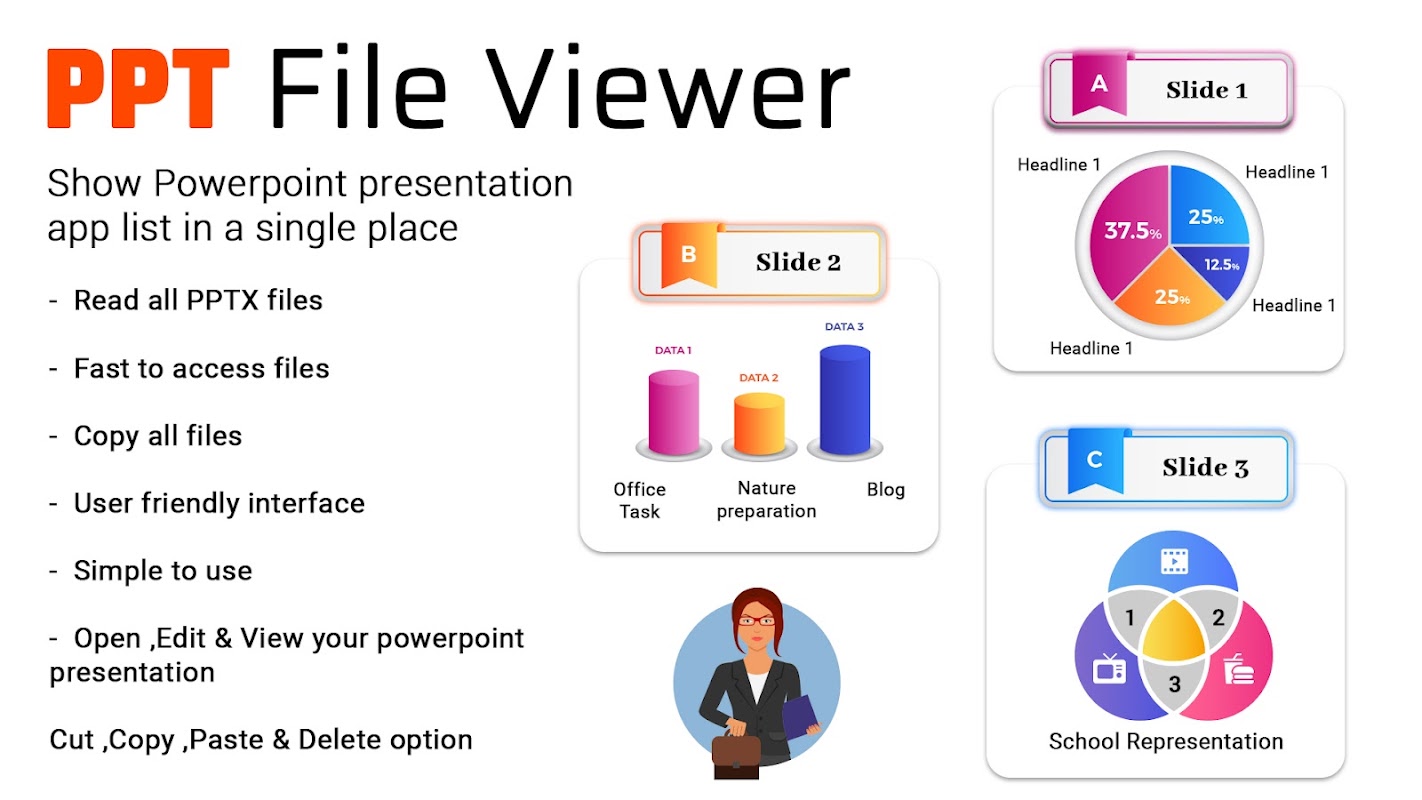 PPT viewer & PPTX file opener for slides view presentation read is free office reader app. PPT reader app lists all the PPT files on your device in one place so that you can easily check and PPT read in PPT viewer. File Viewer is easy to use and fast tool for viewing document presentation files on your device.