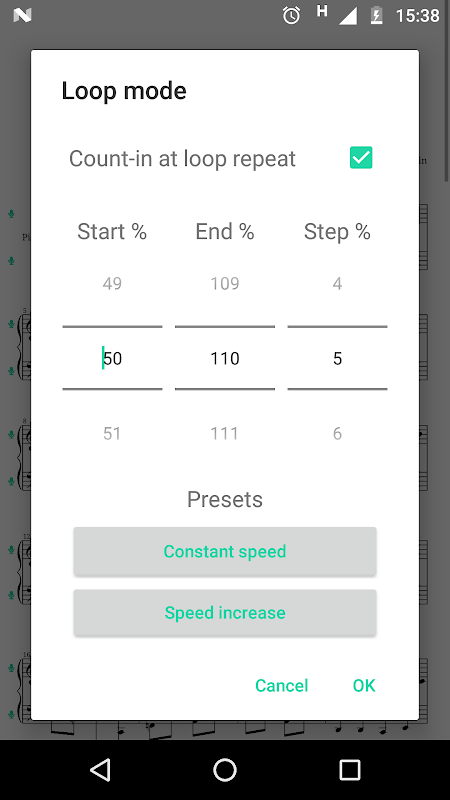 The loop feature allows you to repeat any passage in the score at any BPM tempo so you can overcome the difficulties and add fluidity to your playing.