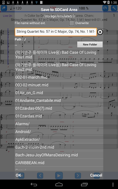 * You can save modified(track, extracted parts, tempo, key, instrument, etc) midi into SD card area (paid version only)
